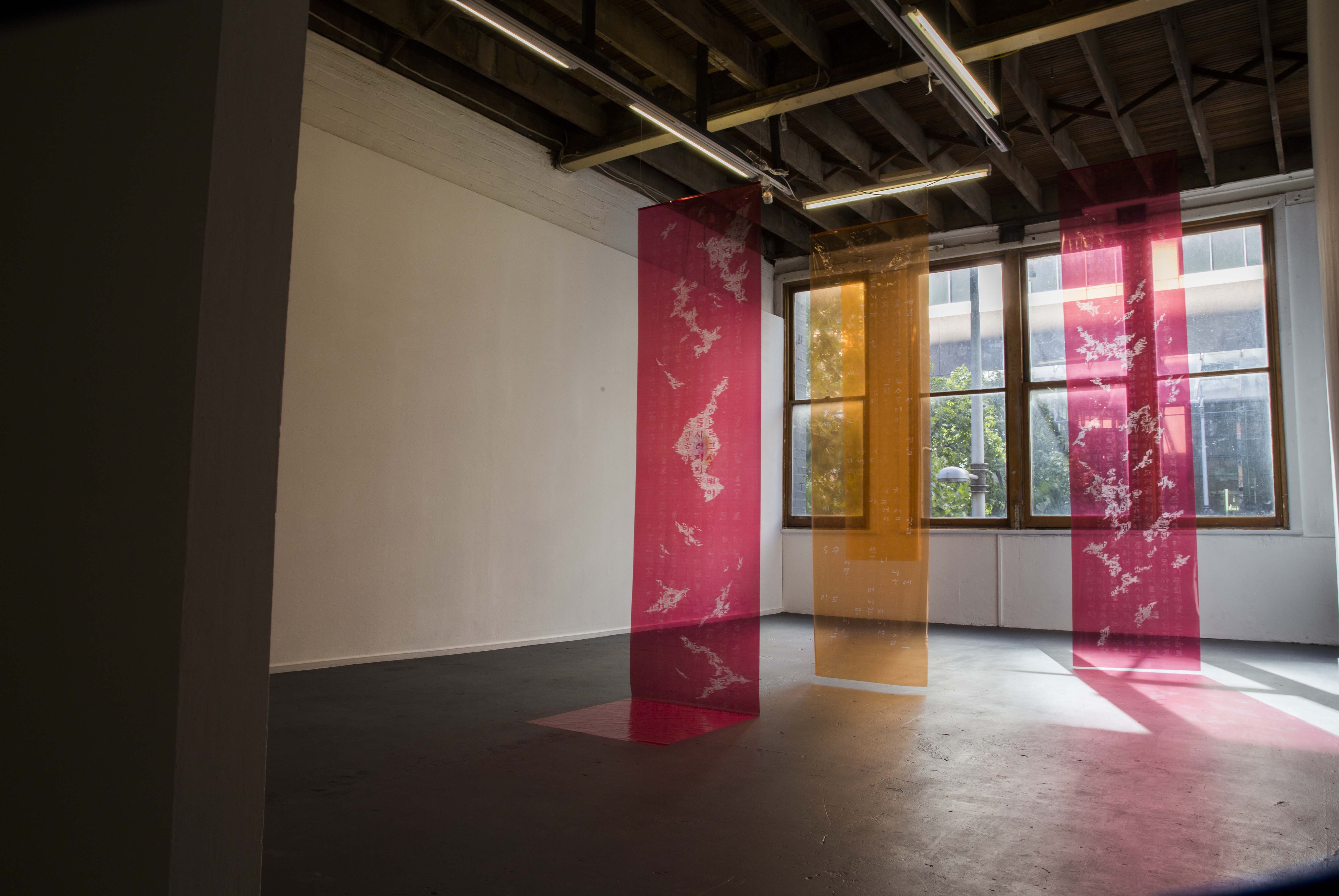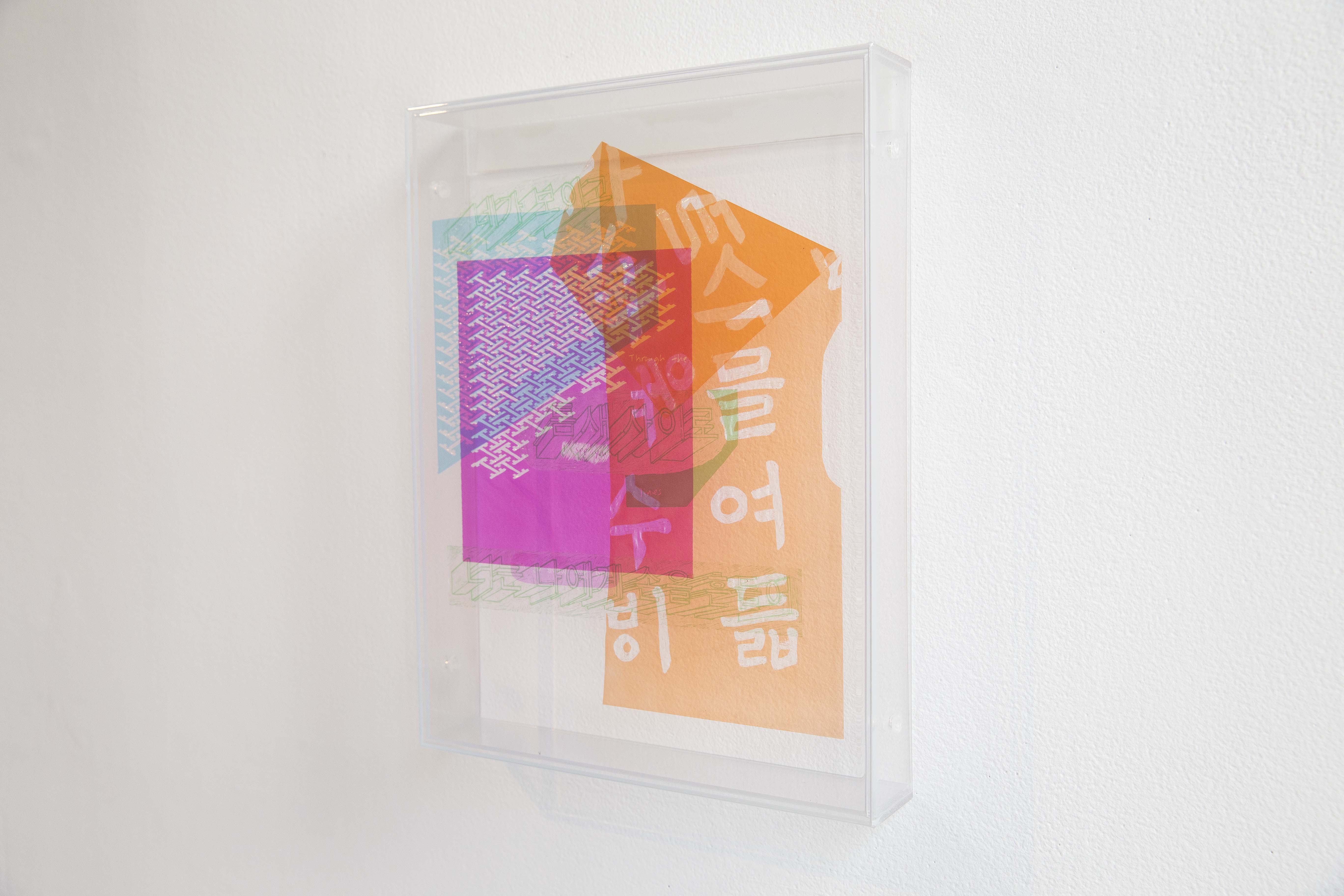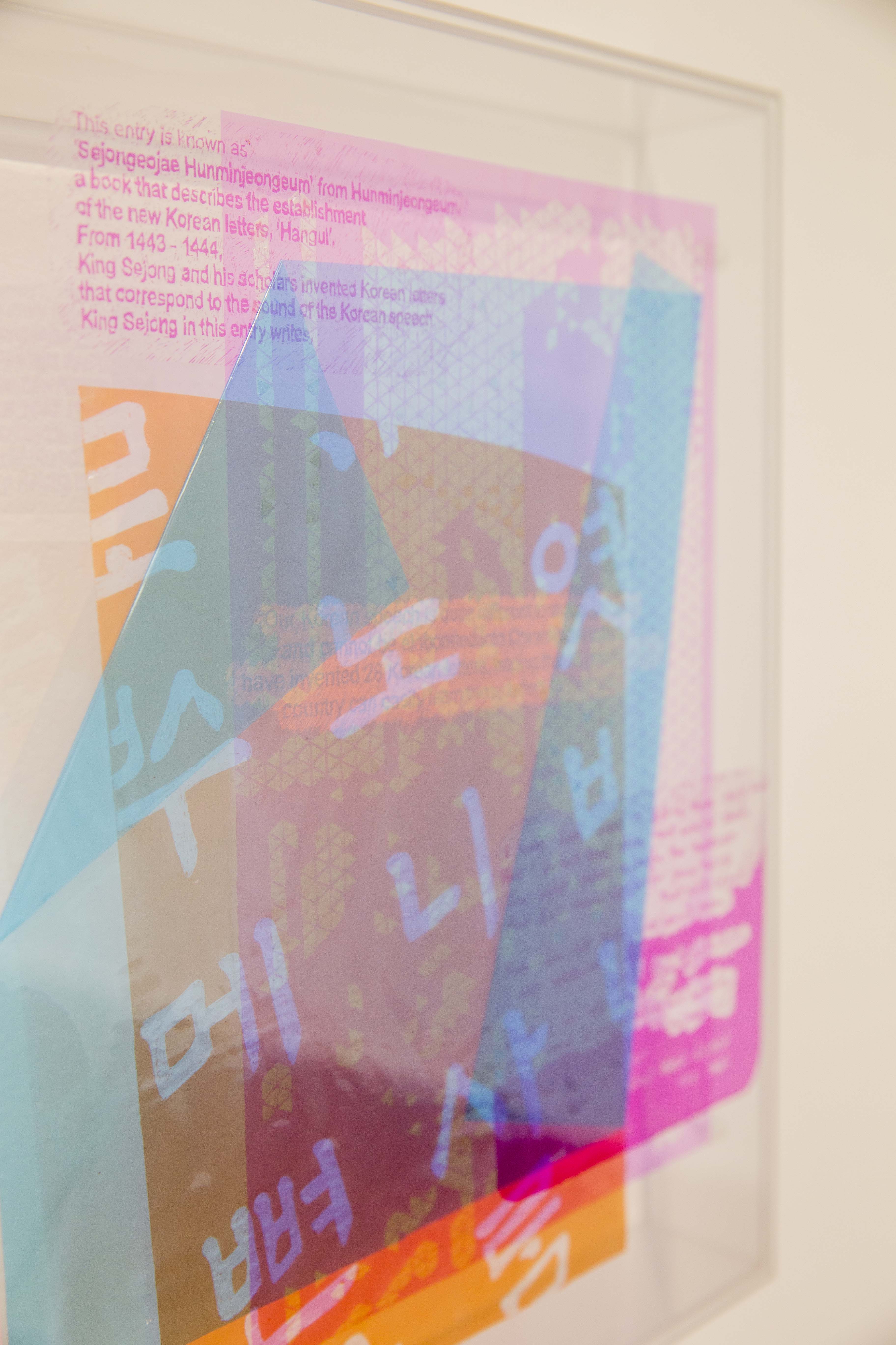 In 1443-1444 King Sejong and his scholars invented the Korean characters called ‘Hangul’. These characters corresponded to Korean speech. Prior to their invention Chinese characters had been used to represent Korean speech. The 28 characters were designed to be easy to learn and use so that ‘Hangul’ could be adopted by all Korean people. The first text, ‘세종어제훈민정음 Sejongeojae Hunminjeongeum’, written by King Sejong and his scholars proclaims that Korean language cannot be represented in Chinese characters and that ‘Hangul’ will now take its place. Korean culture and values have been constructed around Korean speech and characters, and often I have found it almost impossible to translate linguistic expressions and values from ‘Hangul’ to other cultures. I have reproduced ‘세종어제훈민정음’ in cellophane panels. By scratching around this text, I hope to explore the disconnect that occurs within translation, as well as the new possibilities that this uncertainty presents.